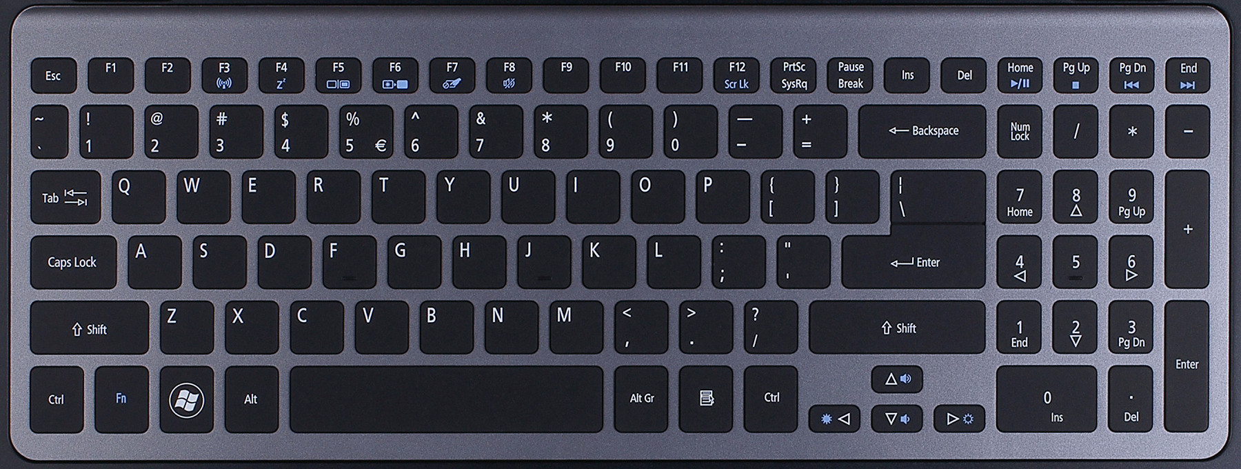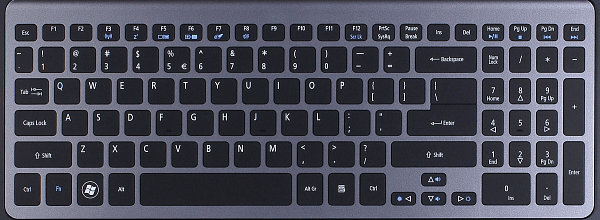 В мобильном компьютере Acer Aspire Timeline Ultra M3 применяется эргономичная клавиатура «островного» типа. Кнопки основного блока достаточно крупные, а вот цифровые немного сжаты по горизонтали. Сами по себе кнопки неплохие, со средним ходом и чёткой отдачей, но расстояния между клавишами слишком велики, что весьма непривычно и приводит к ошибочным нажатиям. Особенно трудно попасть на кнопки со стрелками, которые оставлены очень узкими по вертикали.