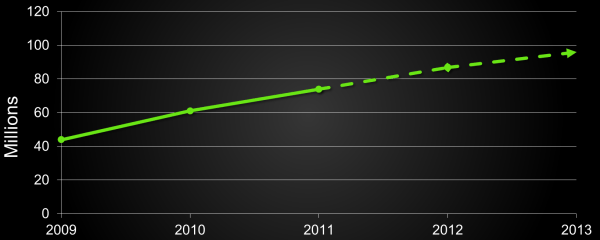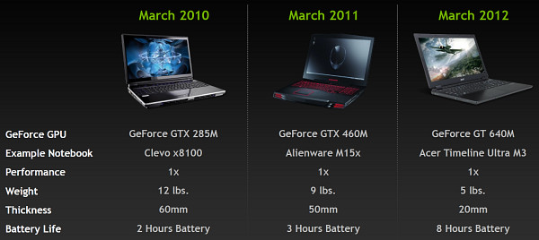 Nvidia приводит пример нескольких ноутбуков разного поколения на базе своих GPU. Если игровые решения 2010 и 2011 годов имеют толщину 50-60 мм, большой вес в 4-5 кг, и их батарей хватает лишь на 2-3 часа работы максимум, то новый Acer Aspire Timeline Ultra M3 при той же 3D-производительности в играх и тестах обеспечивает вдвое-втрое лучшие потребительские характеристики.
