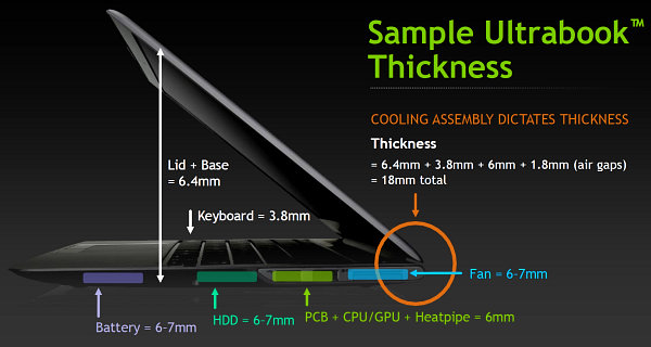 Кроме этого, не нужно забывать о необходимости охлаждения всех комплектующих. Ведь даже если в 20 мм удастся поместить всё необходимое, между разными блоками нужно будет оставить пространство для движения воздуха, охлаждающего комплектующие. Поэтому общая толщина ультрабука продиктована не только габаритами внутренних блоков, но и системой его охлаждения.