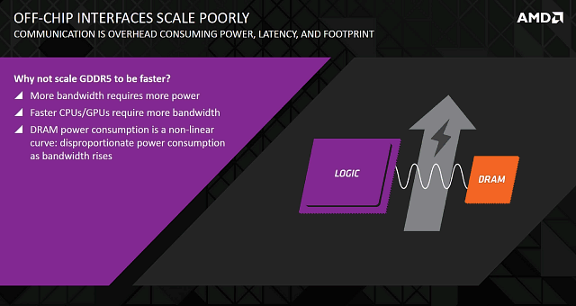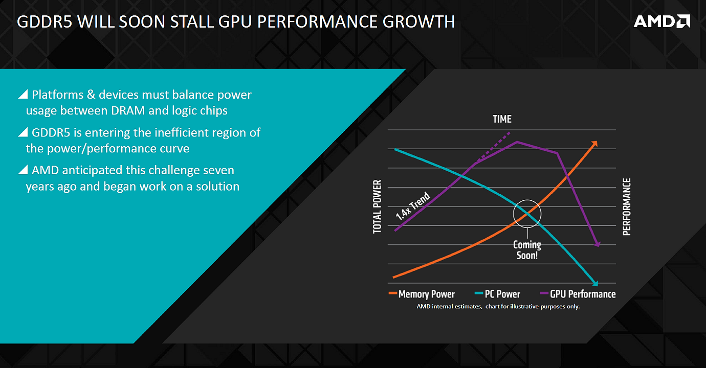 А если представить точно такой же графический процессор, но с GDDR5-памятью, работающей уже на частоте в 7 ГГц? Видеопамять в таком случае будет потреблять еще больше энергии, что лишь усугубит проблему энергоэффективности и оставит GPU без необходимой доли энергии. Компания AMD показывает диаграмму изменения потребления питания GPU и RAM — если ничего не менять, то скоро они сравняются по пожиранию энергии, что приведет к снижению общей производительности.