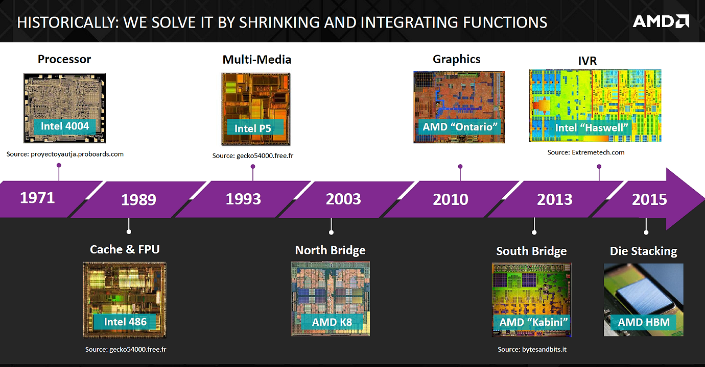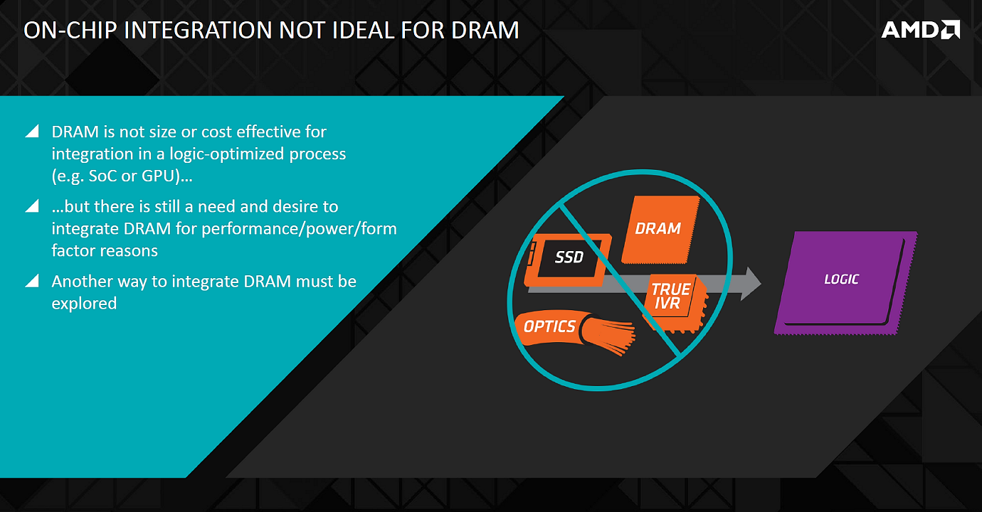 А если поместить микросхемы памяти близко к графическому чипу, то и длинных соединений между ними не требуется, что упрощает конструкцию и предъявляет менее жесткие требования по питанию. Помещение чипов памяти вместе с основной логикой также выигрывает в повышении степени интеграции — большее количество функциональной логики можно собрать в одной упаковке, что уменьшает количество необходимой внешней обвязки. А достижение высокой степени интеграции — давний тренд в индустрии. Все постепенно интегрировалось в кристаллы: сначала кэш-память и FPU, затем чипсетная логика и графические ядра, а теперь вот и память перебирается поближе к вычислительным ядрам.