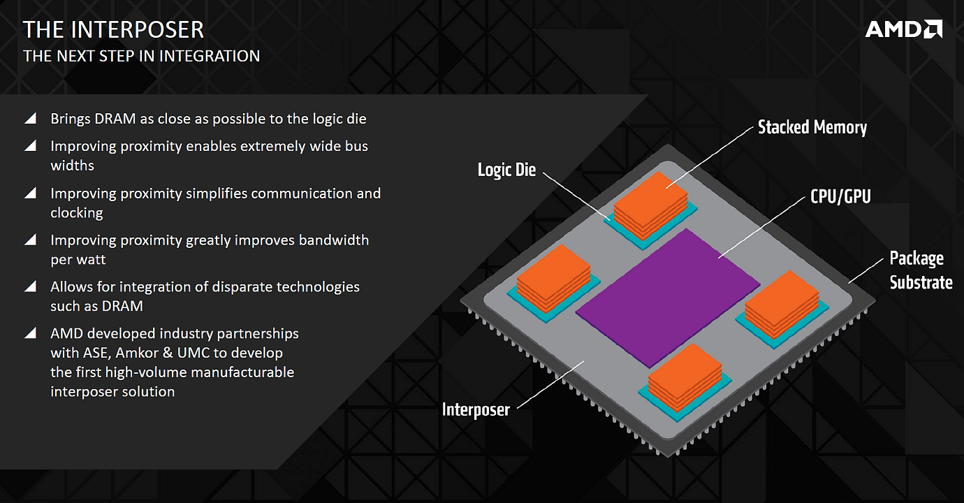 Решением первой части этой задачи стала разработка специального слоя, который способен вместить соединения большой плотности — кремниевой подложки (interposer). Этот слой похож на обычный кремниевый кристалл, в котором вместо некоей внутренней логики размещены исключительно металлические слои для передачи сигналов и питания между различными компонентами — этакий переходник. При производстве interposer используются возможности современных литографических процессов, позволяющих разместить очень тонкие проводники, которые практически невозможно вместить на традиционных печатных платах.