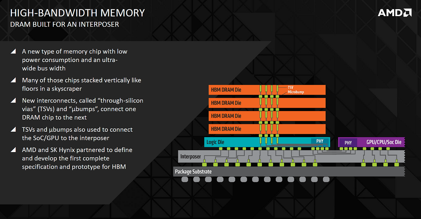 Поэтому проблема объединения стопки чипов DRAM была решена при помощи TSV-соединений. Обычные типы соединений позволяют соединить два слоя вместе, а TSV расширяет эти возможности, соединяя и дальнейшие кремниевые слои. С точки зрения производственного процесса, соединения типа TSV сложнее в производстве и объединение чипов DRAM в стеки является непростой технологической задачей. К стопке чипов памяти снизу присоединено еще и логическое ядро, которое отвечает за работу всех чипов DRAM в стеке и управляет шиной HBM между стеком и GPU.