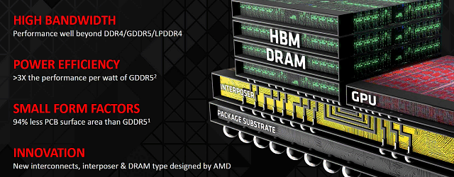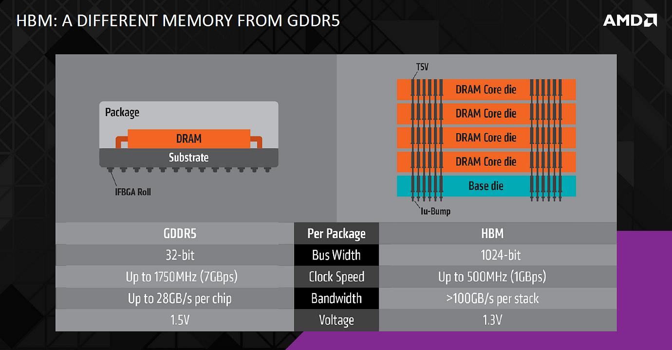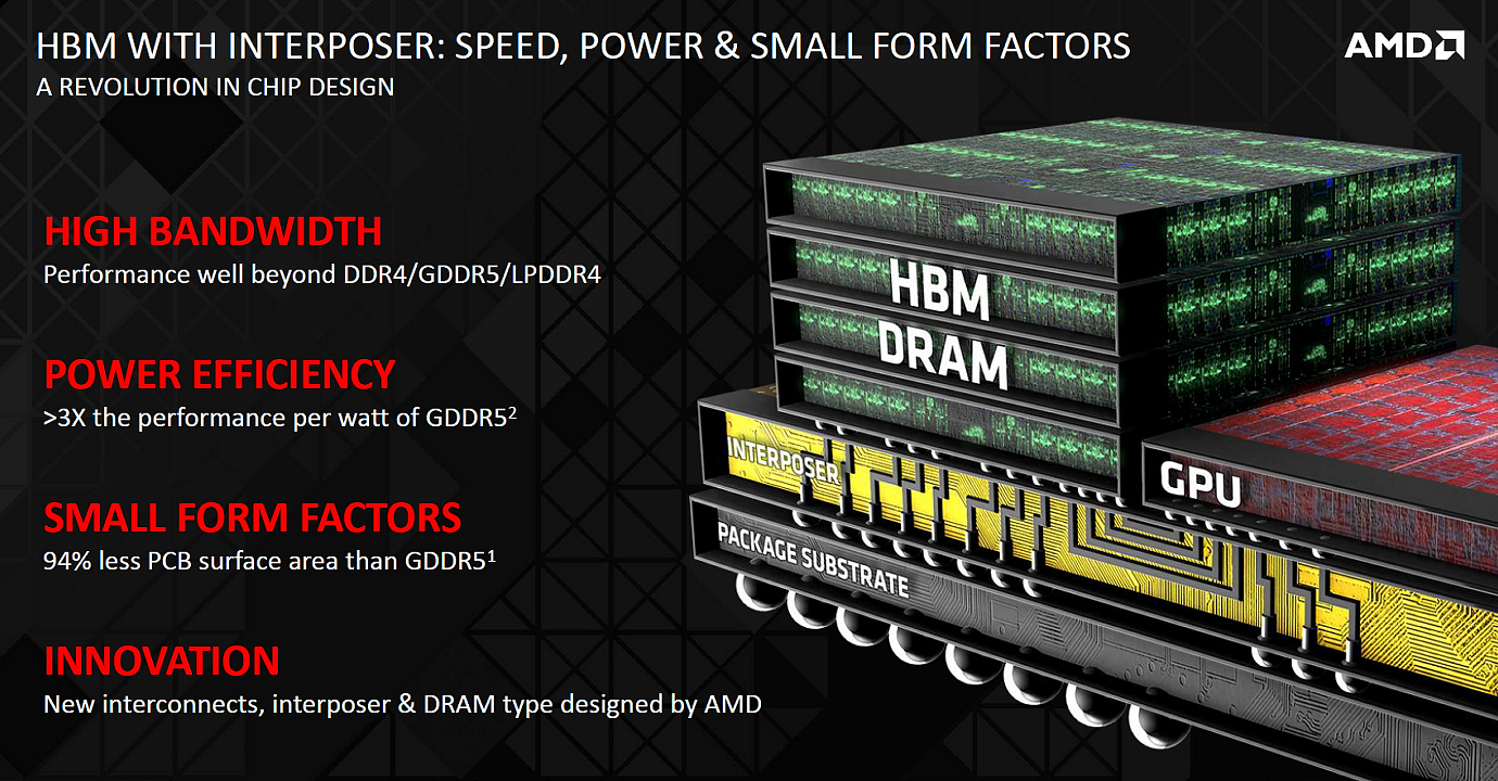 Еще в 2011 году компании AMD и Hynix анонсировали совместные планы по разработке и внедрению нового стандарта памяти — High Bandwidth Memory (HBM). Новый тип памяти должен был стать огромным шагом вперед по сравнению с применяющейся до сих пор GDDR-памятью, и среди главных преимуществ HBM значились серьезное увеличение пропускной способности и увеличение энергетической эффективности (снижение потребления вместе с ростом производительности).