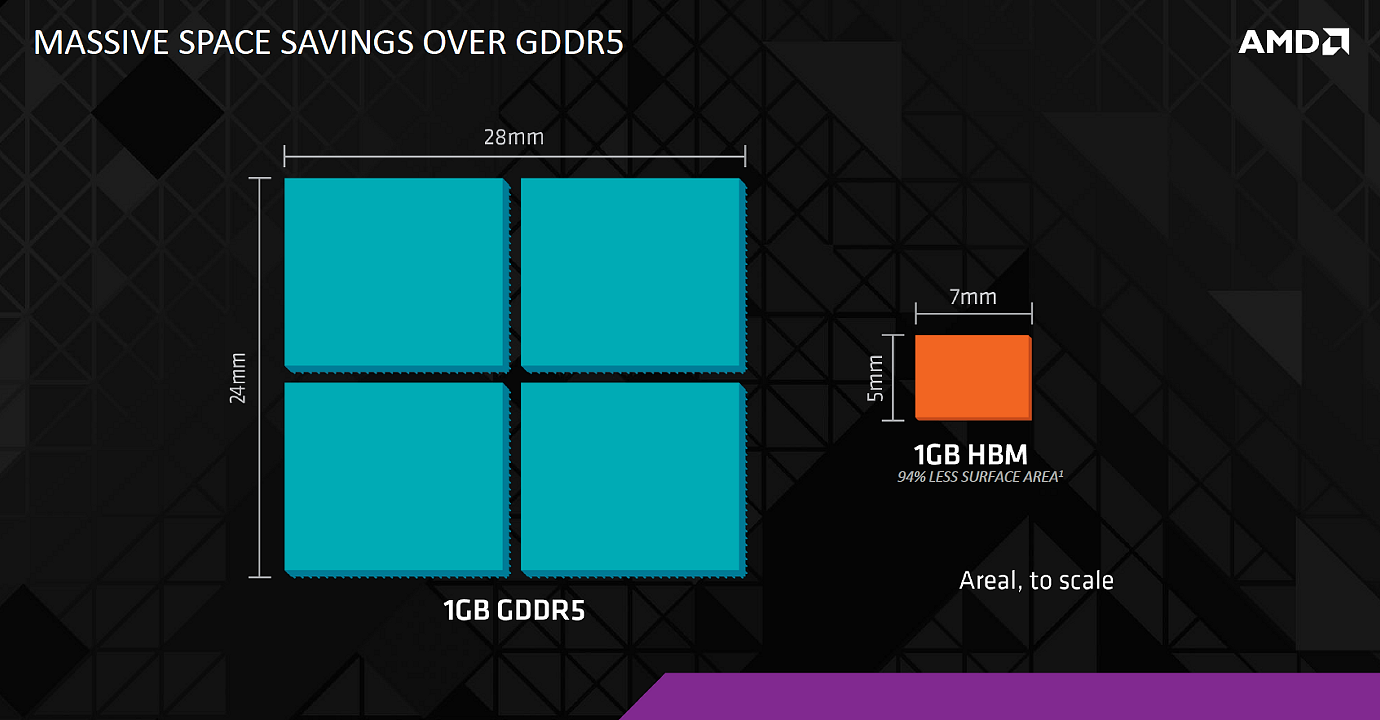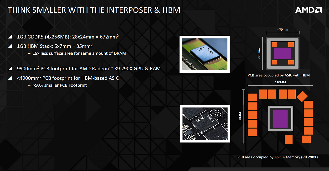 Еще одним преимуществом памяти стандарта HBM, отмечаемым компанией AMD в своих материалах, является компактность в смысле физических размеров всего устройства — GPU вместе с чипами DRAM занимает очень мало места, по сравнению с привычными для нас форм-факторами с большой печатной платой, отдельным GPU и микросхемами памяти, размещенными на ней на некотором отдалении. Естественно, что замена чипов GDDR5-памяти на маленькие HBM-стеки даст итоговое уменьшение размеров всей видеоплаты.