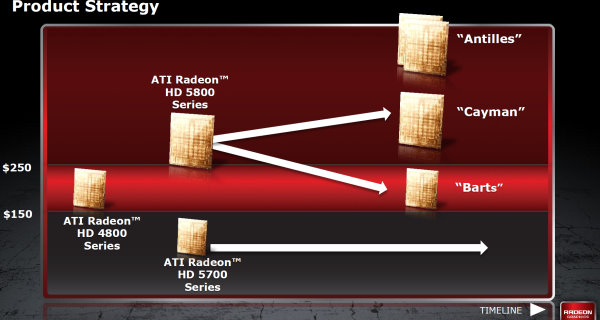 Но Fusion APU — это всё же несколько иной рынок, нежели Radeon, а мы сегодня рассматриваем именно дискретную графику. И семейство под внутренним кодовым названием «Northern Islands» призвано усилить позиции AMD на этом рынке. Косвенная связь новых решений с Fusion есть в том, что через несколько лет мощь нынешней дискретной графики будет доступна и в гибридных APU.