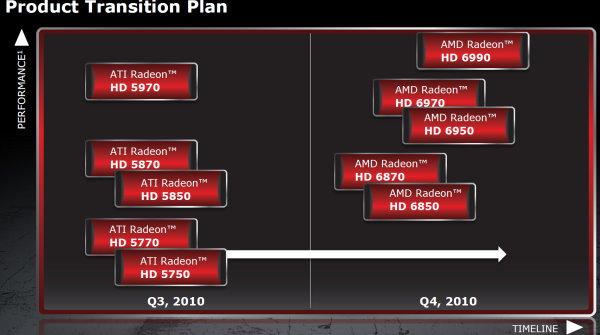 А вот как это выглядит по наименованиям конкретных решений. Получается, что к концу года линейка AMD будет состоять из решений разной архитектуры, так как HD 5700 остаются без изменений (получат ли они переименование в HD 6700 — это вопрос), а в HD 6900 вполне вероятны некоторые архитектурные изменения, по сравнению с 5800 и 6800. Интересна и модель под индексом HD 6990 — судя по всему, это двухчиповая карта на двух Cayman (или Barts?).