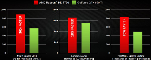 Так что совершенно понятно, что AMD в своих сравнениях упирает больше на вычислительные задачи. К примеру, по данным компании, новая плата Radeon HD 7790 до 70% быстрее по сравнению с Geforce GTX 650 Ti от Nvidia в вычислительных задачах с применением DirectCompute. Что ж, в каких-то особенно удобных задачах такие цифры прироста может и будут, но реальное преимущество явно ниже, особенно с учётом выхода Boost версии GTC 650 Ti.