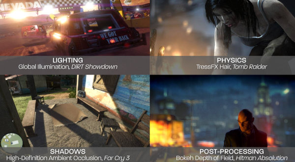 Очень важным компания AMD считает то, что DirectCompute сейчас уже довольно широко применяется в современных играх. Среди примеров можно привести глобальное освещение в игре DiRT Showdown, физику волос TressFX в Tomb Raider, алгоритм расчёта непрямого освещения HDAO в Far Cry 3, а также постобработку (глубина резкости с боке) в Hitman Absolution.