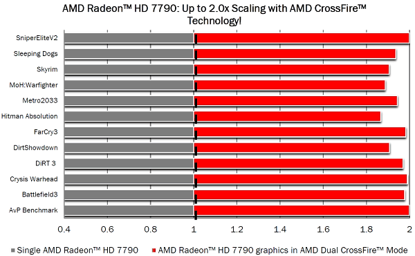 Также Radeon HD 7790 поддерживает технологию многочипового рендеринга AMD CrossFire и обеспечивает отличное масштабирование производительности. На следующей диаграмме показано несколько результатов сравнения одиночной AMD Radeon HD 7790 с многочиповой видеосистемой на базе двух таких плат, использующих CrossFire. Практически все приложения обеспечивают прирост в частоте кадров не меньше 80% при подключении второй платы, а зачастую эффективность CrossFire у двух HD 7790 и вовсе приближается к 100%.
