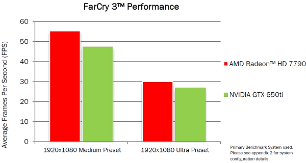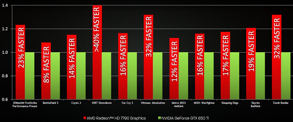 Все эти игры входят в программу Gaming Evolved от AMD, и совершенно неудивительно, что в них применяются алгоритмы, хорошо подходящие для решений компании. В среднем, по оценке компании, Radeon HD 7790 быстрее Geforce GTX 650 Ti в этих играх примерно на 16-32%. Естественно, сторона заинтересованная, использовался FRAPS, да настройки были выбраны по усмотрению AMD, так что слишком серьёзно относиться к цифрам не нужно.