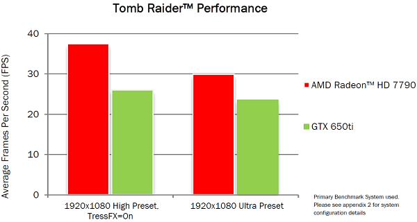 В общем, в Tomb Raider новый Radeon HD 7790 обходит Geforce GTX 650 Ti при высоких настройках, и особенно — с включенной симуляцией волос TressFX Hair. Видимо, какие-то оптимизации для видеокарт Radeon там действительно есть.