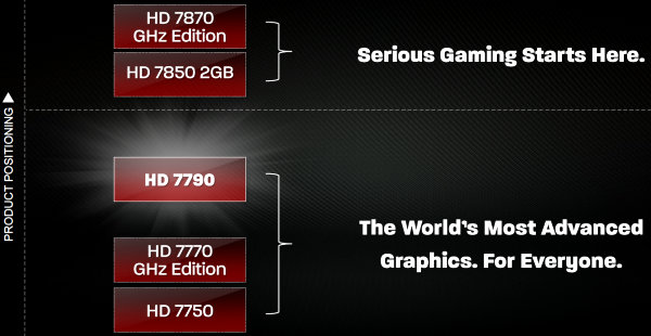 И вот, в марте этого года, практически через год после предыдущих анонсов, компания AMD анонсировала первый GPU, предназначенный для рынка настольных ПК. Новый графический чип получил название Bonaire, а видеокарта на его основе стала называться Radeon HD 7790. Уже по наименованию новинки понятно, что HD 7790 заполнит пробел по цене и производительности между продающимися целый год моделями Radeon HD 7770 и HD 7850, основанными на чипах Cape Verde и Pitcairn, соответственно.