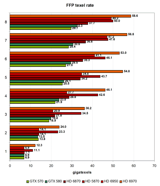 Видеокарты нового семейства компании AMD показывают результаты, полностью соответствующие теоретическим параметрам. HD 6950 немного быстрее, чем HD 5870, а модель HD 6970 является явным лидером теста. Наглядно видно, что текстурная производительность Cayman заметно выросла по сравнению с Cypress. А вот HD 6870 на основе чипа Barts показывает худший результат, аналогичный цифрам топовой видеокарты Nvidia. Ну а GTX 570 проигрывает в текстурировании вообще всем, как и в нашем тесте.