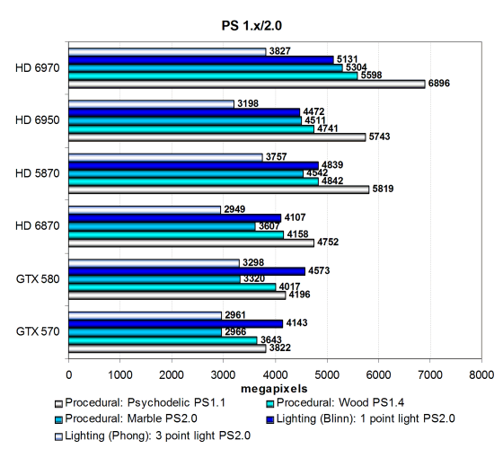 Тесты очень просты для современных GPU и сильно упираются в производительность текстурирования. Поэтому они показывают далеко не все возможности современных видеочипов, но всё же интересны для оценки баланса между текстурными выборками и математическими вычислениями. В данном случае особых отличий между HD 5870 и HD 6950 нет, результаты этих моделей сопоставимы. Хотя один тест выделился — пиксельный шейдер освещения тремя источниками по Фонгу явно зависит от математической производительности GPU, и поэтому уровня HD 5870 в нём достигла только старшая модель — HD 6970.