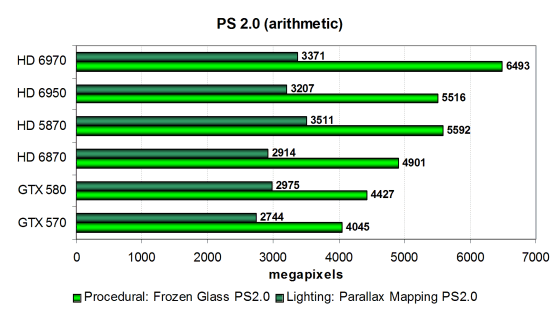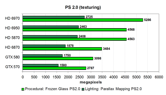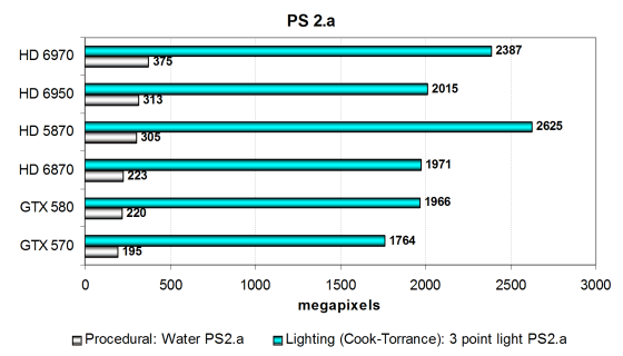 В свою очередь, HD 6950 также оказывается не только впереди своего конкурента GTX 570, а обогнала ещё и предшественницу — HD 5870. Отмечаем несколько бо́льшую эффективность блоков ROP и более высокую скорость заполнения у новых моделей видеокарт компании AMD по сравнению со старыми чипами.