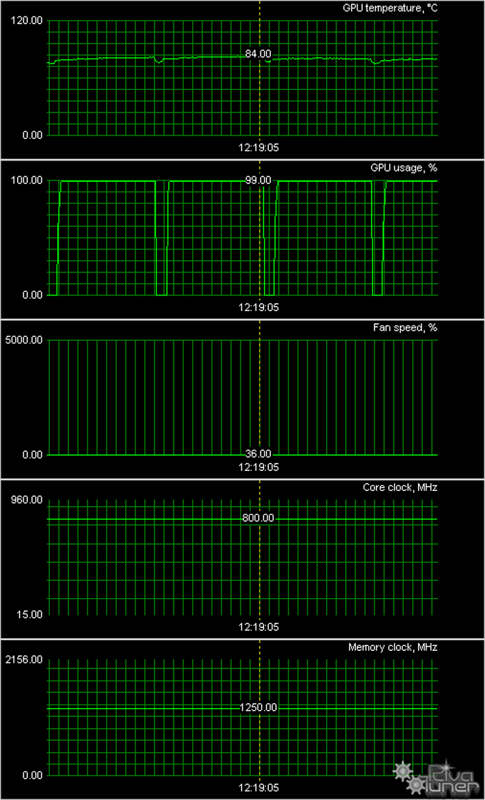 Мы провели исследование температурного режима с помощью утилиты MSI Afterburner (автор А. Николайчук AKA Unwinder) и получили следующие результаты:
