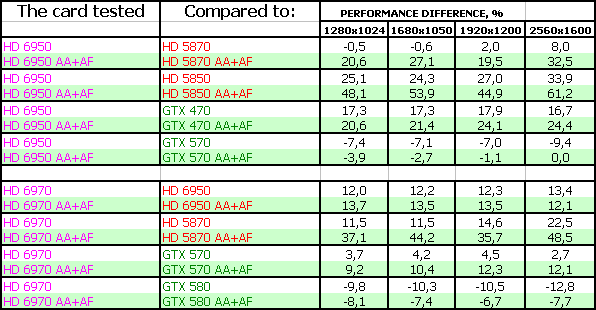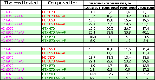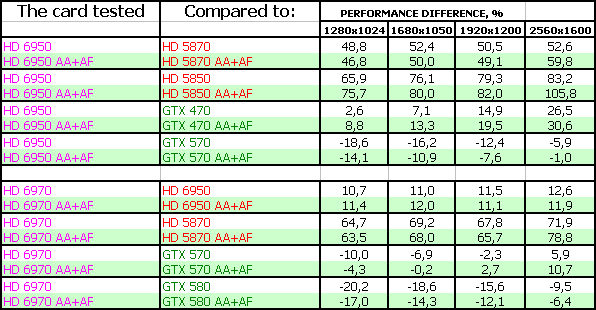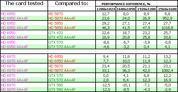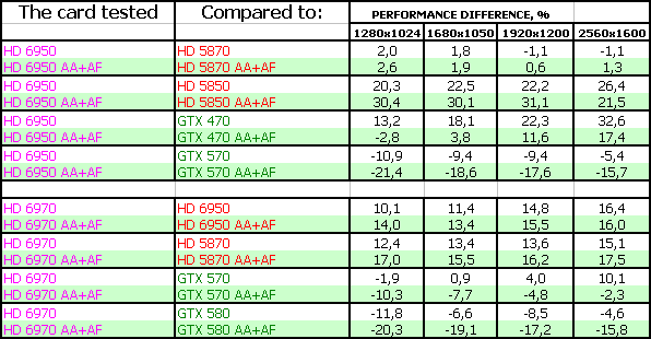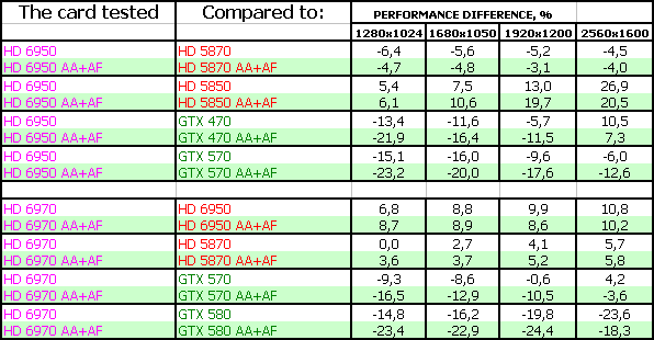AMD Radeon HD 6970 2048 МБ 256-битной GDDR5, PCI-E оказался в целом быстрее, чем Geforce GTX 570, но при этом медленнее флагмана GTX 580. Однако у новых продуктов есть и иные достоинства. Во-первых, объем памяти в 2 гигабайта, что для топового ускорителя современного класса уже весьма востребованно. Во-вторых, увеличенная скорость тесселяции, которая дает больший комфорт в DX11-играх. В-третьих, приемлемое энергопотребление и при этом малошумная система охлаждения. В-четвертых, способность вывода картинки на всевозможные на сегодня типы мониторов, включая до 6 приемников через DisplayPort. Дополнительно идет плюс в виде AMD Eyefinity. А также это первый ускоритель с новой архитектурой, в которой повышен КПД работы потоковых процессоров (ALU), а также впервые внедрена система балансировки энергопотребления и производительности. Обкатка новых технологий позволит в будущем использовать их более эффективно на следующих техпроцессах. Продукт (рекомендованная цена для США на середину декабря 2010 — 369 долларов) позиционируется по цене чуть выше GTX 570 (рекомендованная цена для США на середину декабря 2010 — 349 долларов), но зато по скорости будет получше.