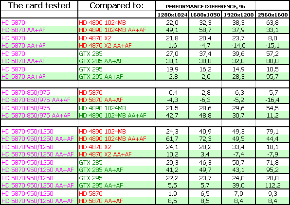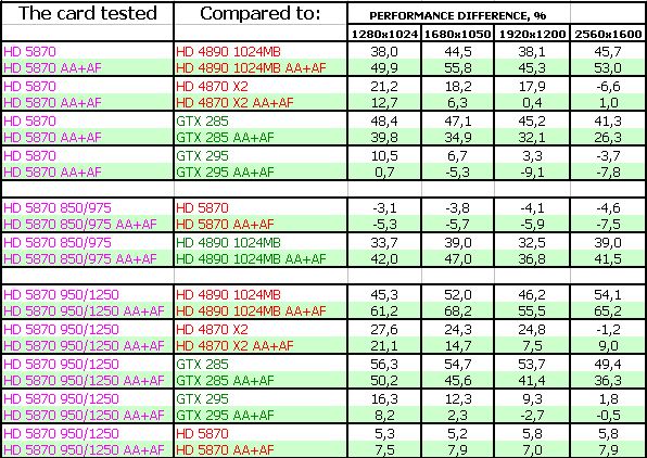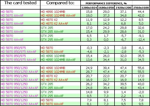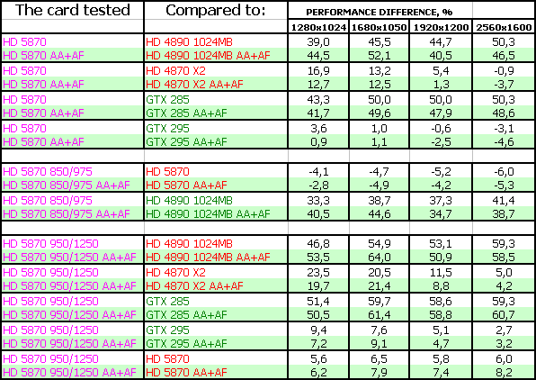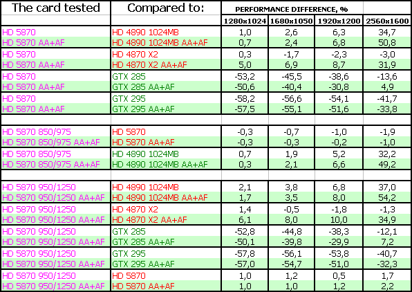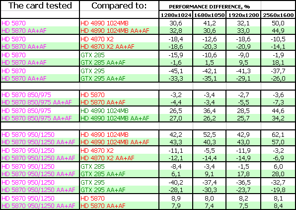 ATI RADEON HD 5870 1024MB PCI-E — оказался просто супер-ускорителем в своем ценовом классе (напомним, что на 23 сентября 2009 года его рекомендованная розничная цена — 399 USD). Новинка легко обошла идентичного в ценовой категории соперника в лице Geforce GTX 285 и даже подчас догоняла более дорогой продукт Geforce GTX 295. А уж беспрецендентный разгон и вовсе заставил бороться однопроцессорному новому ускорителю с двухпроцессорным более дорогим GTX 295 на равных.