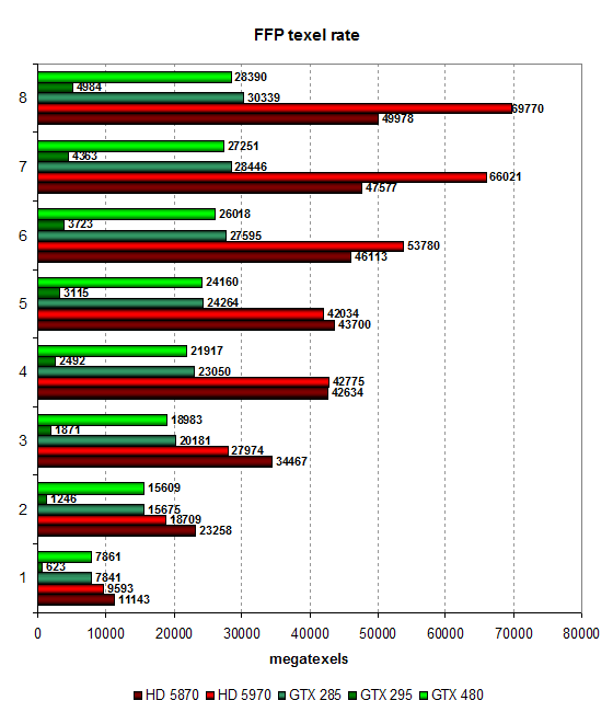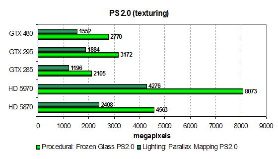 Картинка в чём-то схожая, но с текстурными выборками карты AMD справляются явно лучше, особенно двухчиповый HD 5970 тут хорош! Сегодняшний герой в виде GTX 480 снова показывает средний между GTX 285 и GTX 295 результат, так как тут ещё более явно виден упор производительности в скорость текстурных блоков, и их количество у GF100 для новой мощной графической архитектуры всё же явно недостаточное.