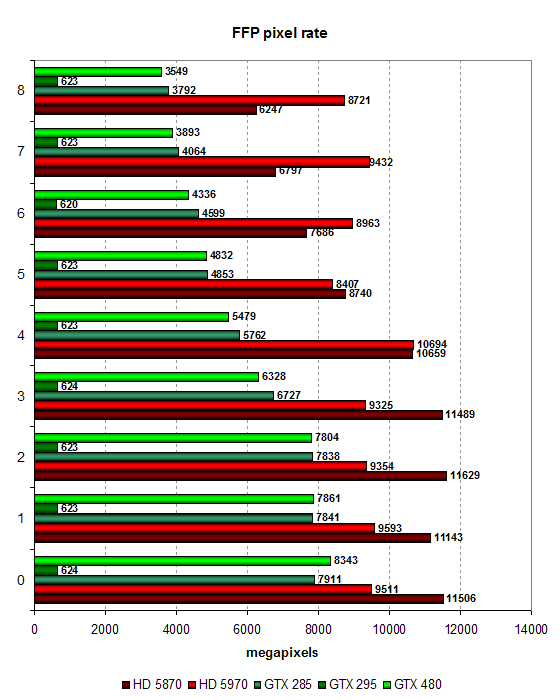 Разница между GTX 480 и GTX 285 почти всегда одинаковая, кроме случаев с небольшим количеством текстур, где больше сказывается ограничение в ПСП. И HD 5870 в этих тестах не так уж далеко впереди. А вот при 4-8 текстурах разница становится большей, что намекает о недостатке скорости текстурирования GF100 для того, чтобы всегда быть впереди конкурента в устаревших игровых приложениях. Посмотрим на эти же результаты в тесте филлрейта: