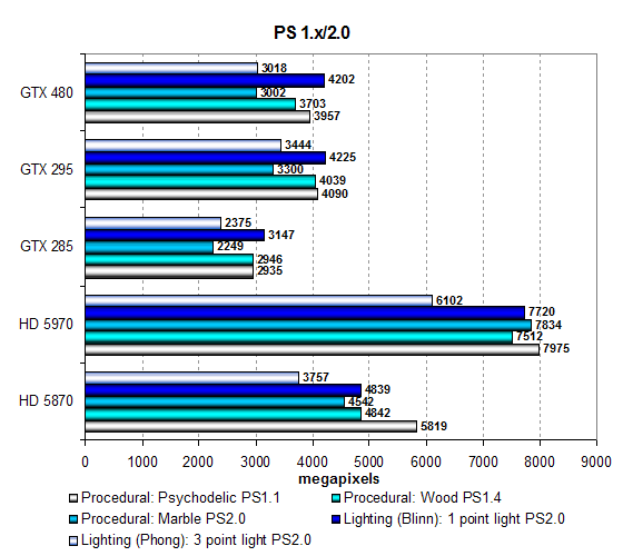 Пропускная способность памяти в этих тестах лишь немного ограничивает новые решения, и скорость зависит от текстурирования, что не позволяет карте на базе GF100 показать результаты даже на уровне Radeon HD 5870, не говоря уже о двухчиповом решении AMD. Видеоплаты на чипах производства Nvidia в этом наборе тестов явно отстают, что является тревожным звоночком для других наших тестов, где важна скорость текстурирования. Посмотрим на результаты несколько более сложных пиксельных программ промежуточных версий: