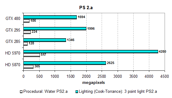 В тестах пиксельных шейдеров версии 2.a всё даже ещё хуже, если сравнивать со скоростью конкурентов. В сильно зависящем от скорости текстурирования тесте процедурной визуализации воды «Water» используется зависимая выборка из текстур больших уровней вложенности, и карты всегда располагаются по скорости текстурирования, но с поправкой на разную эффективность использования TMU.