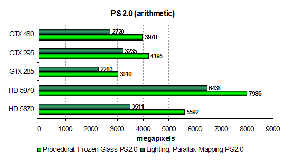 Следующая пара тестов пиксельных шейдеров содержит минимальное количество текстурных выборок для снижения влияния производительности блоков TMU. В них используется большое количество арифметических операций, и измеряют они именно математическую производительность видеочипов, скорость выполнения арифметических инструкций в пиксельном шейдере.