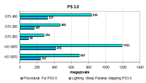 Итак, с новой архитектурой GF100 мы отмечаем очень большой прирост производительности в сложнейших PS 3.0 тестах. В которых важнее всего не пиковая математическая мощь, которая имеется у решений AMD, а эффективность выполнения сложных шейдерных программ с переходами и ветвлениями. Ну и удвоенная математическая мощь, по сравнению с GT200, тоже сказалась. Очень хороший результат, ведь обогнать решение архитектуры AMD, имеющей большее количество исполнительных блоков ALU, это дорогого стоит.