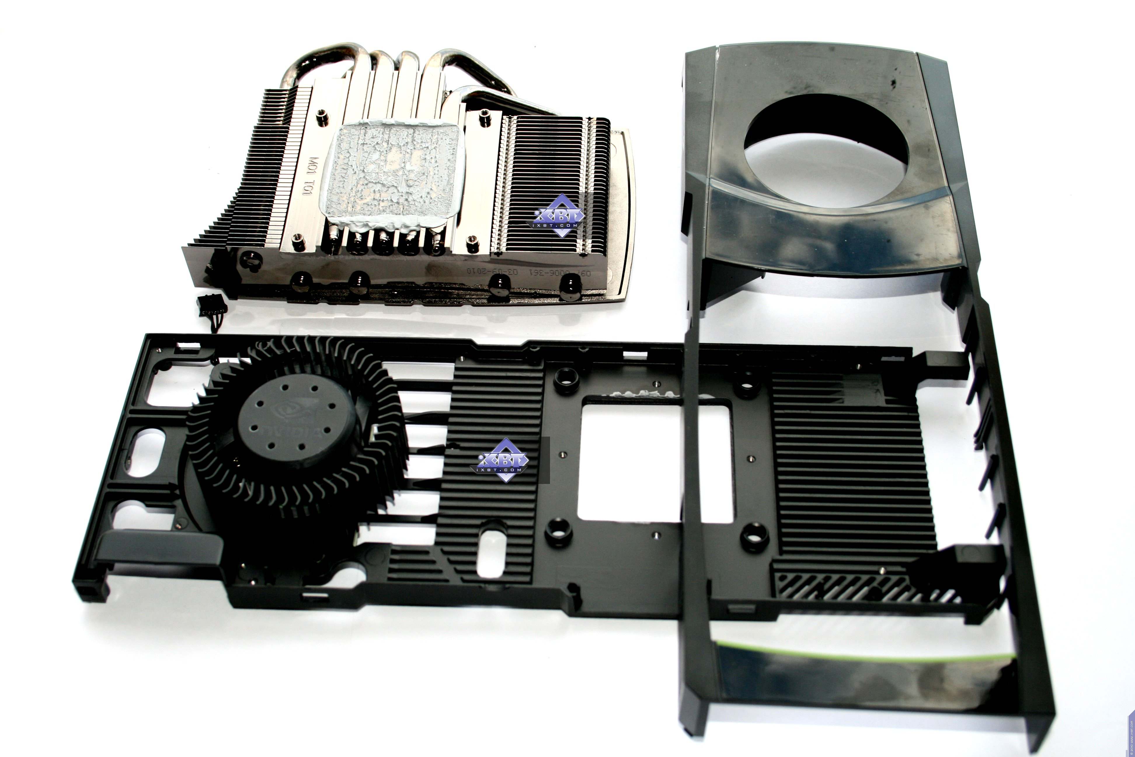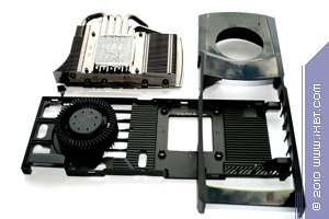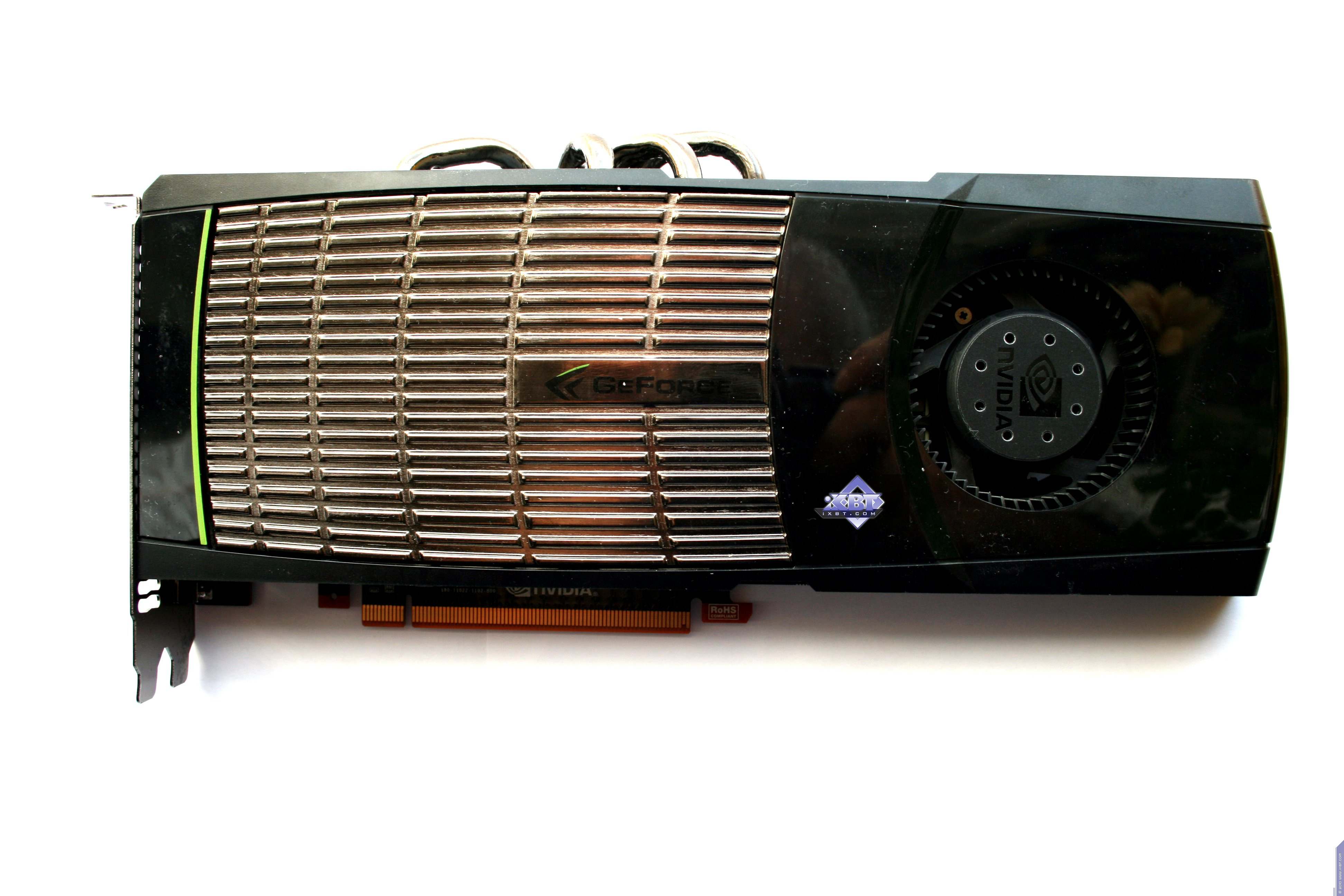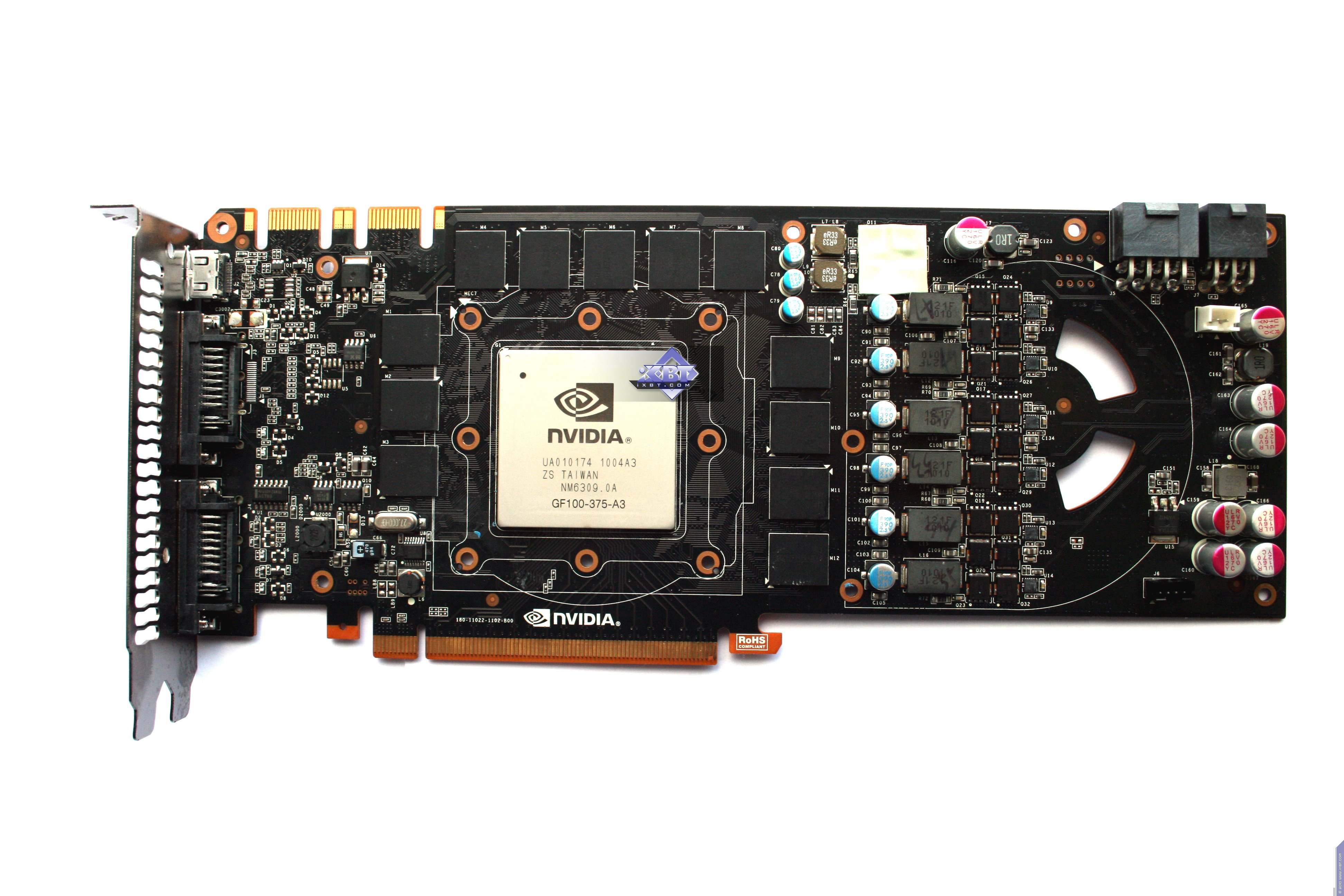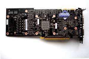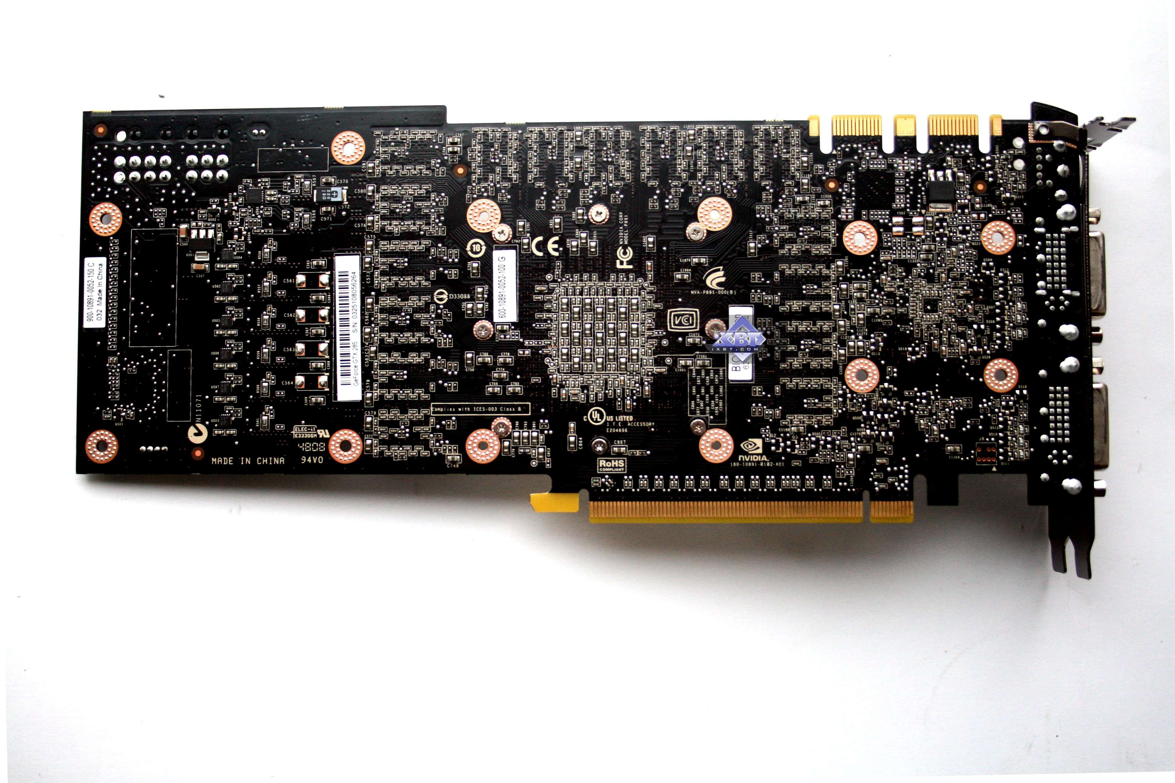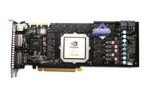 Мы сравнили новый продукт с последним предыдущим однопроцессорным рещением от Nvidia, имеющим 512-битный интерфейс обмена с памятью. Очевидно, что из-за того, что ныне шина уменьшена до 384 бит, а также из-за отсутствия отдельного блока NVIO, дизайн PCB несколько упрощен и стал дешевле. Однако в то же время усилен блок питания, поскольку ускоритель потребляет экстремально много  до 300 Вт, а это сравнимо с двухпроцессорным решением предыдущего поколения GTX 295.