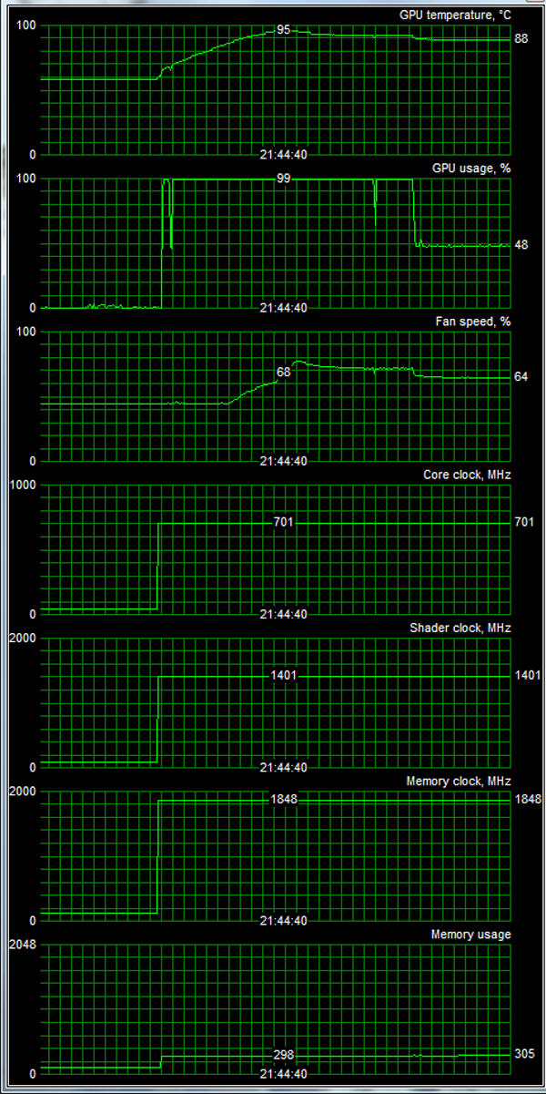 Мы провели исследование температурного режима с помощью утилиты  EVGA Precision (автор А. Николайчук AKA Unwinder) и получили следующие результаты: