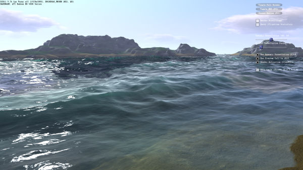 Но давайте рассмотрим ещё один тест  демонстрационную программу Nvidia Realistic Water Terrain, также известную как Island. Кстати, автор этой программы  известный 3D-энтузиастам Тимофей Чеблоков aka Smalltim. Его демка Island использует тесселяцию и карты смещения (displacement mapping) для рендеринга реалистично выглядящей поверхности океана и ландшафта. Смотрится она просто отлично: