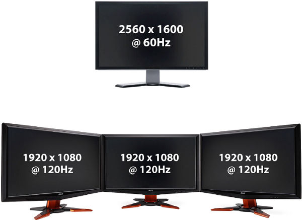 Естественно, что после анонса главным конкурентом технологии, позволяющей выводить изображение сразу на три монитора, как-то ответить было бы очень желательно. И Nvidia пошла даже ещё дальше, предложив возможность вывода изображения на три устройства в стереорежиме.