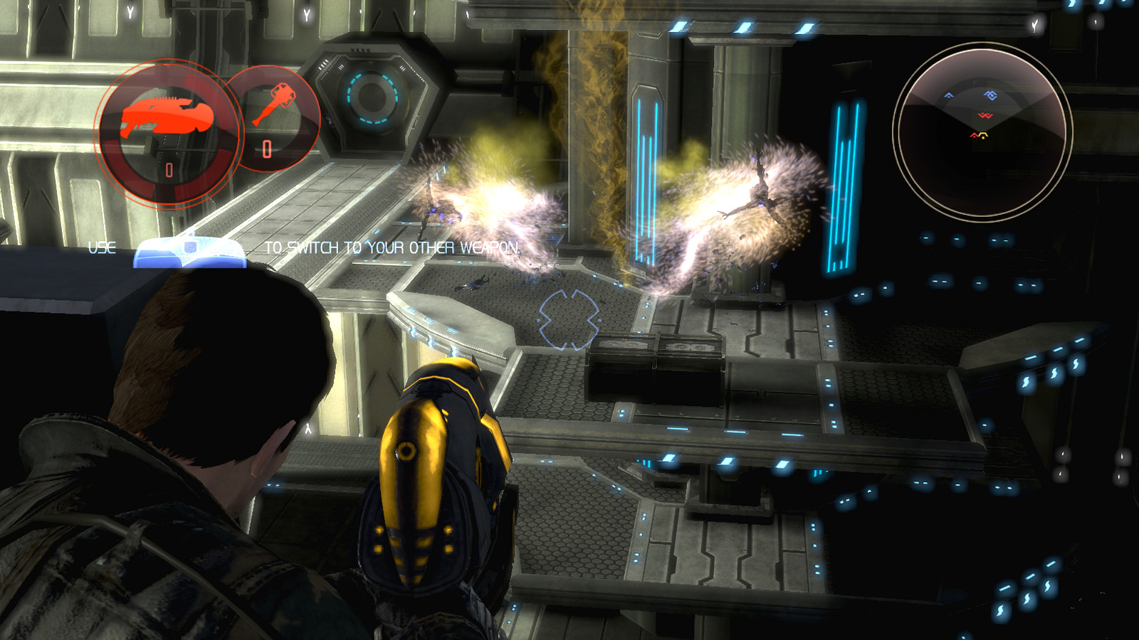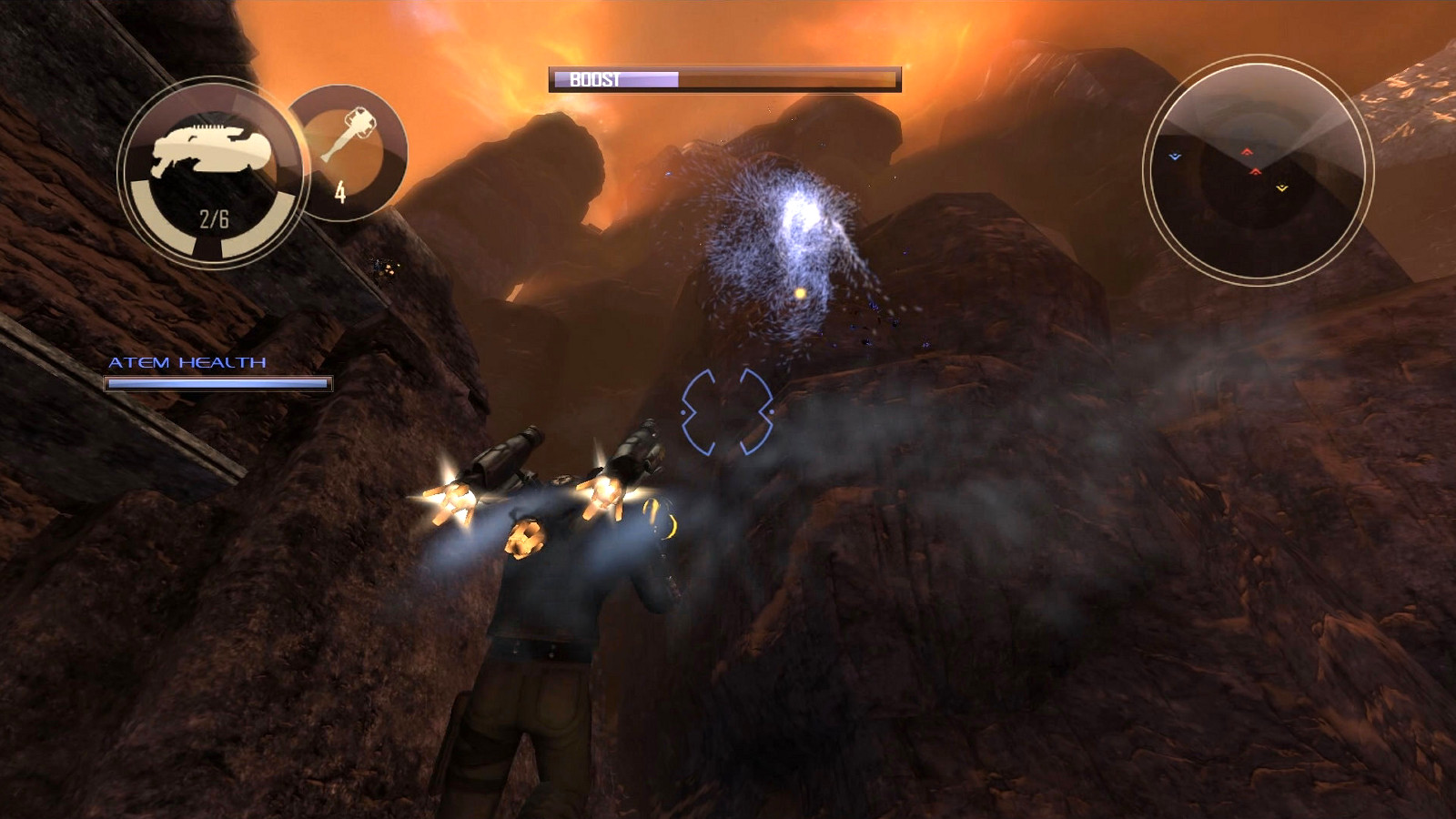 Также в Dark Void можно увидеть множество различных физических эффектов, созданных на основе систем частиц. Обычно их хорошо видно при выстрелах из разнообразного оружия и при попадании этих выстрелов в поверхности. Как на этом скриншоте: