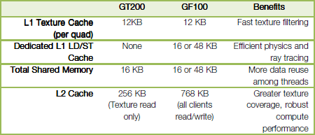 Архитектура чипа GF100 была спроектирована для эффективного исполнения различных алгоритмов и решения множества задач, поддающихся распараллеливанию. Таким алгоритмам, как трассировка лучей, физические расчёты и искусственный интеллект, общая память бесполезна, и в этом случае поможет кэш-память, имеющаяся в GF100. 48 килобайт кэша первого уровня на каждый из мультипроцессоров и использование глобального кэша второго уровня повысит производительность многих алгоритмов.