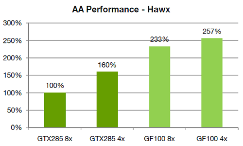 Предыдущие поколения архитектур Nvidia отличаются большим падением производительности рендеринга при включенных режимах сглаживания с восемью мультисэмплинговыми выборками. Так, в игре Tom Clancy’s HAWX, средний FPS у GTX 285 в режиме MSAA 8x получается на 60% ниже, чем при MSAA 4x. С GF100 ситуация совсем иная, производительность в режиме 8x лишь на 10% ниже, чем при 4x. См. диаграмму: