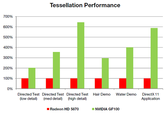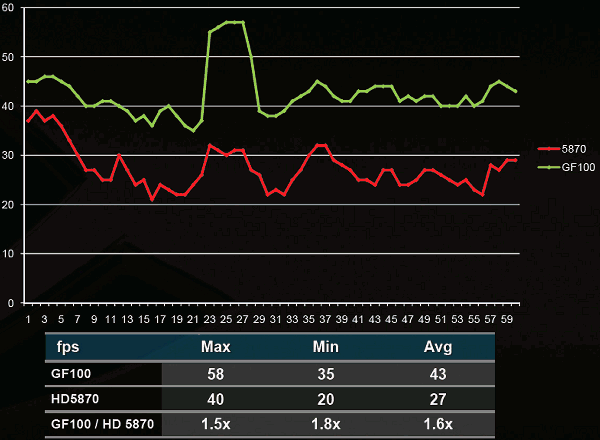 Красивой теории написано много, а где же хотя бы примерные цифры производительности? По оценке Nvidia, наличие выделенных тесселяторов в каждом из мультипроцессоров и блоков растеризации в каждом кластере GPC даёт прирост геометрической производительности GF100 вплоть до восьмикратного, по сравнению с GT200. Посмотрим, что получается на практике, при сравнении уже с лучшим из конкурентов RADEON HD 5870: