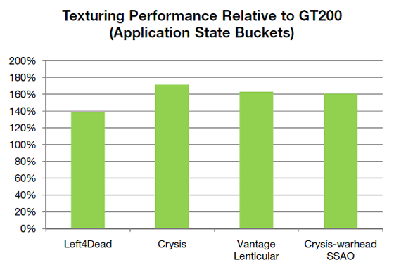 И даже с учётом того, что у GT200 больше блоков текстурирования, чем у GF100, новый чип обеспечивает большую производительность текстурирования в реальных приложениях. Посмотрим, как этот прирост оценивает сама Nvidia.