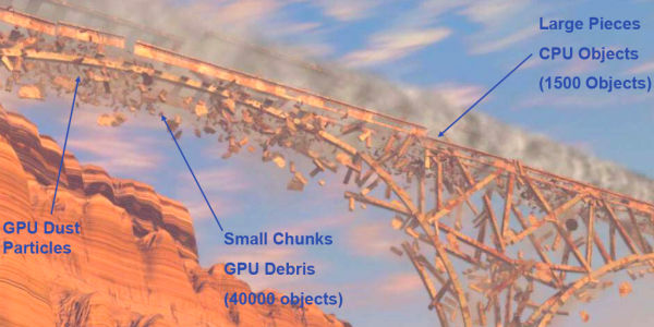 Наиболее впечатляюще выглядят разрушения объектов. Например, мост может разрушаться на заранее заданное количество твёрдых тел, вплоть до миллиона! При этом GF100 обеспечивает интерактивную частоту кадров, и смотрится это очень эффектно.