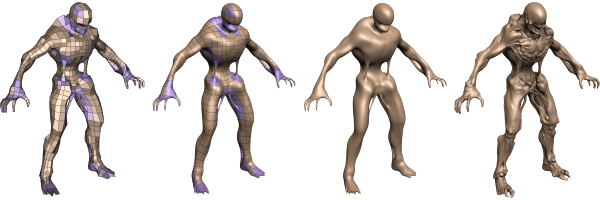 Мы уже рассматривали в статье по ссылке выше, как это делается. Посмотрите на рисунок, слева изображена упрощённая модель, использующая четырёхугольные примитивы. Она весьма несложная, по сравнению с нынешними моделями персонажей, используемыми в играх. Далее идёт изображение, полученное при помощи тесселяции. Оно очень сглаженное и с отсутствующими острыми углами.
