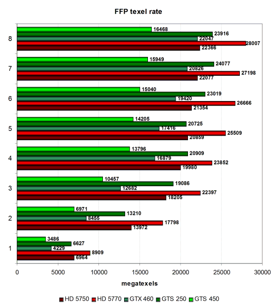 В очередной раз в этом тесте у нас получилась привычная картина. Видеокарты компании Nvidia показывают цифры, далёкие от теоретически возможных значений. Поэтому результаты данной синтетики можно сравнивать лишь в пределах решений одного производителя. По ним получается, что GTS 450 выбирает до 21 текселя за один такт из 32-битных текстур при билинейной фильтрации в этом тесте, что значительно ниже теоретической цифры в 32 отфильтрованных текселя.