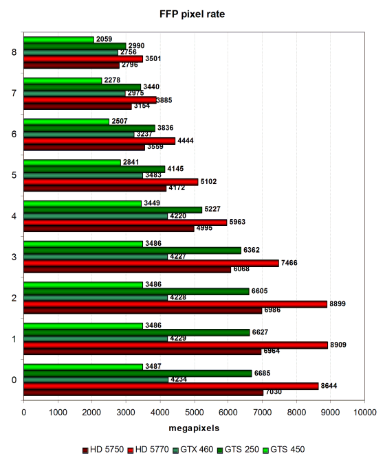 Результаты теста соответствуют теоретическим цифрам лишь приблизительно. GTS 450 снова показывает самую низкую производительность, что особенно хорошо видно на фоне обоих конкурентов от компании AMD, имеющих значительно большую пропускную способность памяти. Да и от GTS 250 новое решение отстаёт именно из-за меньшей ПСП а ведь теоретическая производительность подсистемы ROP у него выше. Ещё один синтетический тест упёрся в ПСП, поэтому нам кажется весьма интересным вариант с 192-битной шиной, если таковой всё же появится.