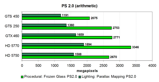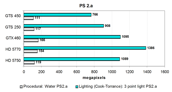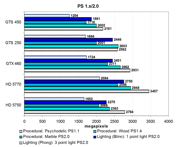 По паре GTS 250 и GTX 460 видно, что старая архитектура справляется с поставленными задачами лучше, так как их результаты весьма близки, а теоретически GTX 460 лучше во всём, кроме текстурирования и ПСП. Да и по эффективному филлрейту разница не очень велика. GTS 450 в этих тестах не может достичь даже уровня Radeon HD 5750, не говоря о более мощном HD 5770. Посмотрим на результаты более сложных пиксельных программ промежуточных версий: