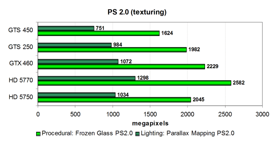 В этих тестах производительность ограничена по большей части скоростью текстурных модулей, но с учётом эффективности блоков и кэширования текстурных данных. Похоже, что изменений в архитектуре GF106, по сравнению с GF104, на примере GTS 450 и GTX 460, просто нет, а разница связана с количественными показателями. Представленная сегодня видеокарта Nvidia снова показала худший результат в данных простых тестах.