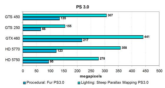 В этих тестах рассматриваемый сегодня GTS 450 показывает результат явно выше HD 5750 и с переменным успехом соперничает и с HD 5770, обгоняя в одном тесте и уступая в другом. К сожалению, в тесте продвинутого параллакс маппинга, новое решение Nvidia всё же уступает Radeon HD 5770, имеющему большее количество потоковых процессоров в GPU. Зато с GTS 250 новая видеокарта расправилась просто шикарно, более чем вдвое обогнав её в PS3 тестах. Отличный результат!