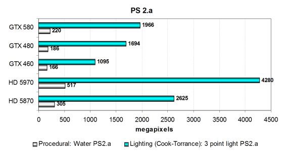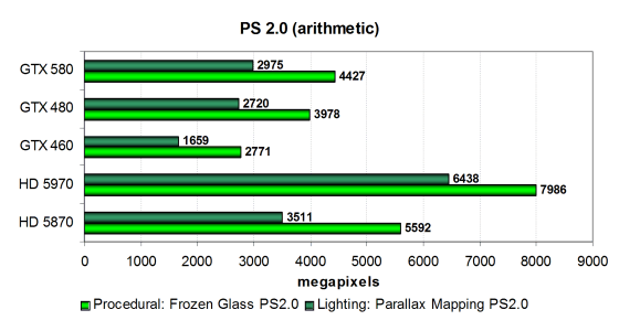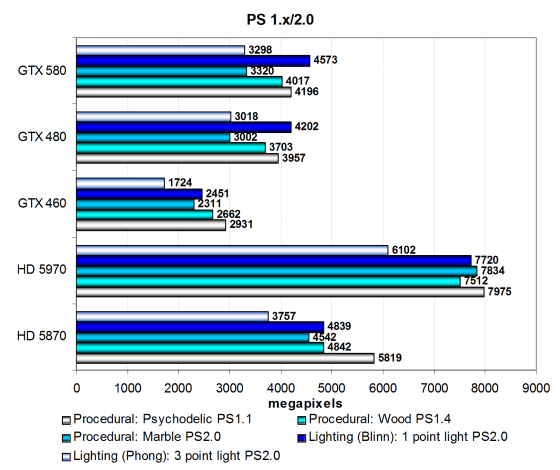 Следующая пара тестов пиксельных шейдеров содержит минимальное количество текстурных выборок для снижения влияния производительности блоков TMU. В них используется большое количество арифметических операций, и измеряют они именно математическую производительность видеочипов, скорость выполнения арифметических инструкций в пиксельном шейдере.