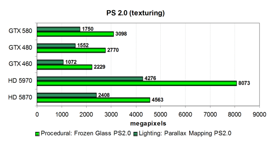 К сожалению, даже тест Futuremark не показывает того теоретически возможного удвоения скорости текстурных выборок в определённых условиях. Зато в их тесте текстурной производительности получается совсем иное соотношение результатов, по сравнению с нашим. И эти цифры больше похожи на истинное положение дел. Хотя даже в этих тестах карты Nvidia более эффективно используют имеющиеся текстурные блоки, но продолжают отставать от решений AMD, что вполне объяснимо с точки зрения теории — у последних банально больше блоков TMU.
