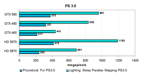 Это первые из DX9-тестов, в которых видеокарты производства Nvidia выглядят сильнее, чем решения AMD. Похоже, что с тестами более сложных пиксельных шейдеров версии 3.0 у решений Nvidia всё далеко не так плохо. Оба PS 3.0 теста довольно сложные, скорость в них почти не зависит от ПСП и текстурирования, они отличаются большим количеством ветвлений, с которыми очень неплохо справляется новая архитектура Nvidia.