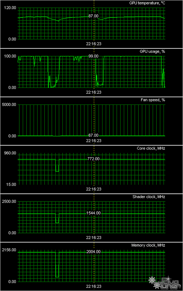 Мы провели исследование температурного режима с помощью утилиты  EVGA Precision (автор А. Николайчук AKA Unwinder) и получили следующие результаты: