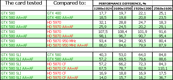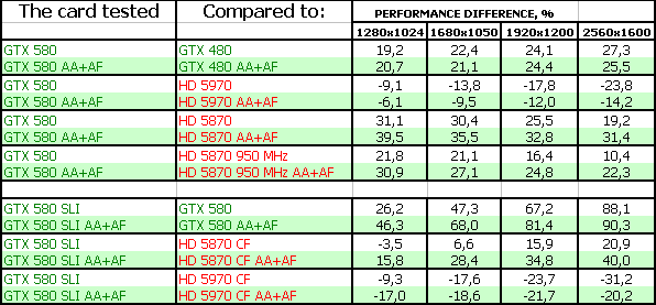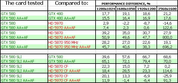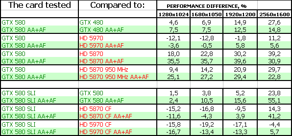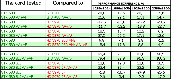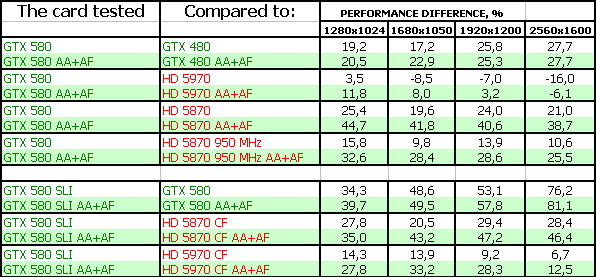 Nvidia Geforce GTX 580 1536MB 384-битной GDDR5, PCI-E — как и следовало ожидать, оказался не только абсолютным лидером среди однопроцессорных ускорителей, обойдя своего предшественника на 15—20%, но и даже в целом выйдя в лидеры, во многих тестах обходя двухпроцессорного Radeon HD 5970.